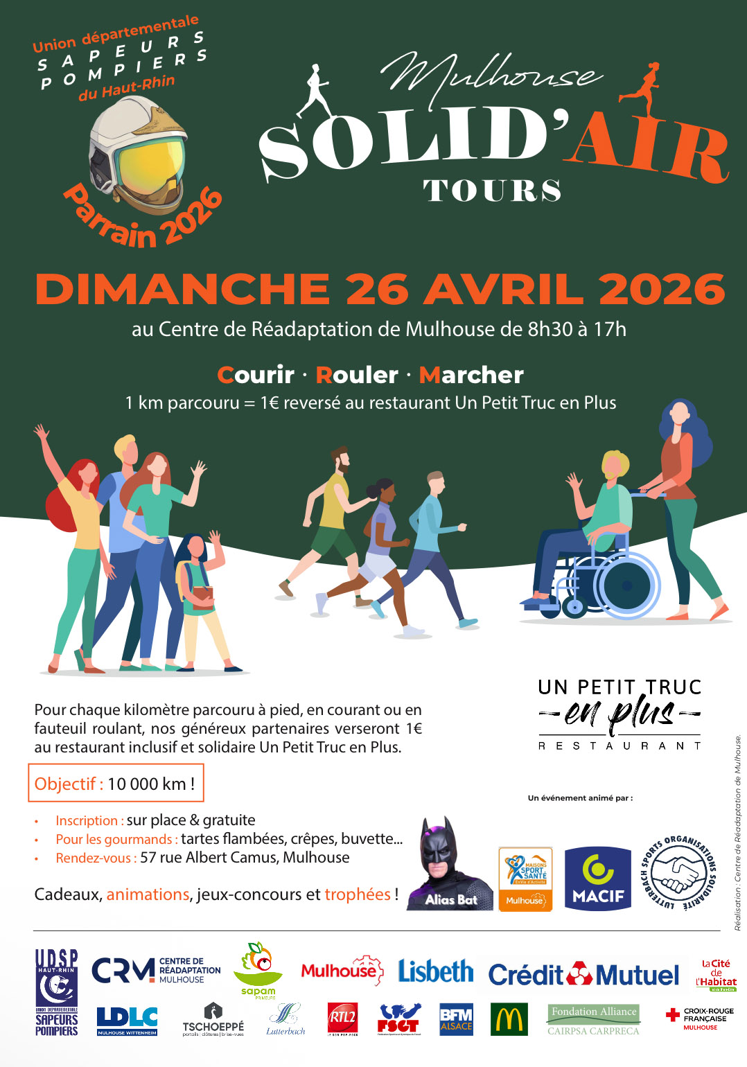 La décision de réitérer l’opération réussie en 2025 avec plus de 9.000 € d’aide obtenue avec le parrainage du champion paralympique Joseph FRITSCH a naturellement été prise. Le parrain de cette 4ème édition est l’Union Départementale des Sapeurs-Pompiers du Haut-Rhin grâce au Commandant Franck KOEBERLEN chef du Centre de Secours de MULHOUSE et à la détermination de Jacques BALDECK, membre actif de S.O.S.L. mais aussi pompier volontaire. Beaucoup de jeunes sapeurs-pompiers participeront et des démonstrations de « Gestes qui sauvent » et autres actions de nos amis « soldats du feu » auront lieu toute la journée.